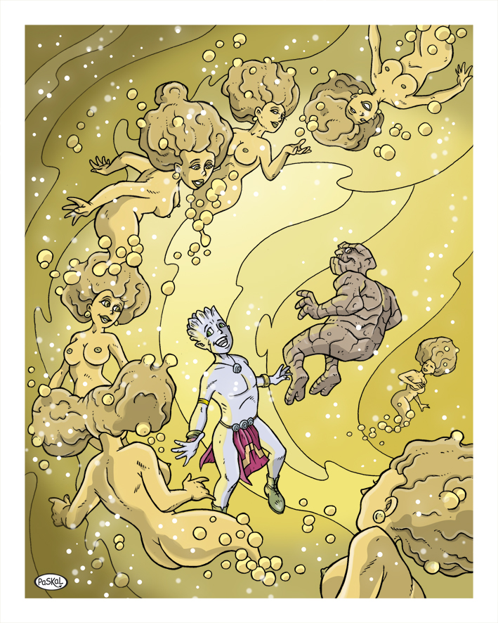 Il sembla à Sparite qu’un instant s’était déroulé depuis sa mise en bouteille. Mais il en était rien. Il avait été enfermé dans ce sarcophage de verre depuis quatre ans déjà. Mais cela paraissait n’avoir duré que quelques jours. Le temps semblait s’être presque arrêté pour nos amis, comme suspendu. Quatre ans depuis que l’énorme bouchon de liège avait solidement obstrué la seule issue de cette bouteille. Et c’est là, dans cette atmosphère confinée que naissent les fées d’effervescence. La bouteille en était maintenant peuplée. Car les Levuriens ne pouvant roter et péter à volonté dans cet espace devenu trop exigu, font naitre de leurs gaz refoulés des choses absolument charmantes. Ces merveilles de la nature se nomment : fées d’effervescences. C’était donc cela le secret de ces fées.