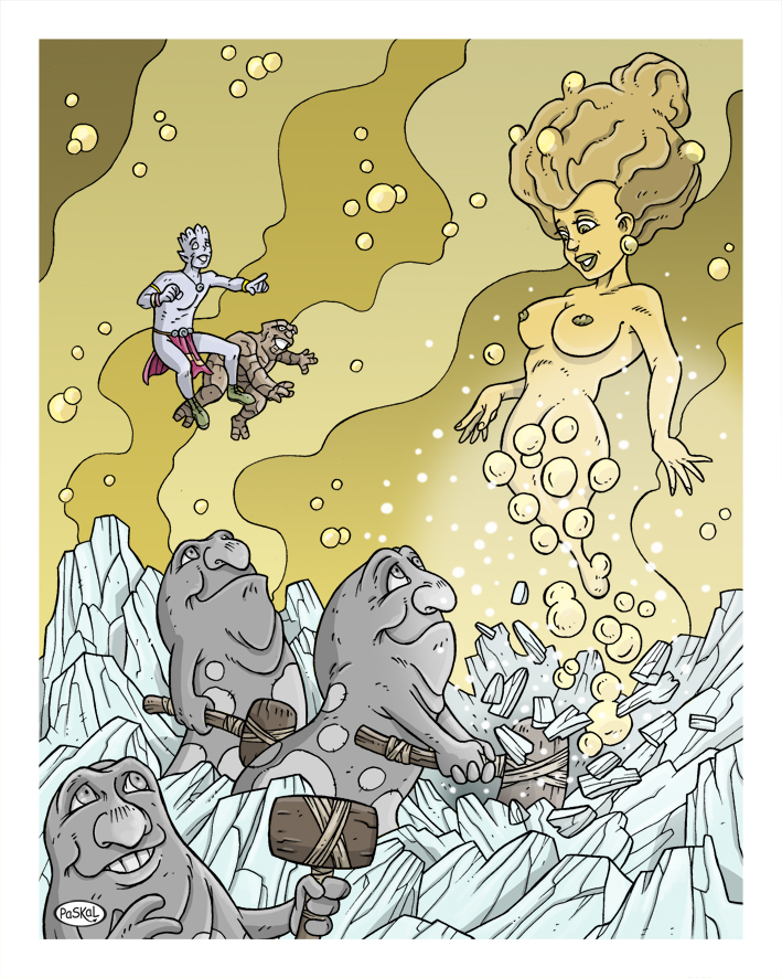 Du pire lisier souvent née la plus belle rose. C’était le cas ici, ces fées si subtiles et si délicates naissaient de nos gros patauds rigolos de Levuriens. Sparite le cristal de Calcite et Fred, son dernier compagnon d’infortune, se trouvaient emprisonnés avec les fées d’effervescence. Les fées étaient charmantes, elles chantaient, riaient et s’amusaient toute la journée dans une totale insouciance. Le temps passait vite au milieu de cette fête permanente. Elles vivaient au jour le jour comme dans un paradis perdu, toujours aux petits soins pour nos amis. Elles nous faisaient oublier le temps qui passe. Les fées n’étaient pas pressées de sortir de leur harem, car elles savaient que leur vie était éphémère. Dés que le bouchon sauterait. A la sortie de cette cage de verre, leur temps était compté. La fée d’effervescence ne vit pas longtemps dans l’air. Cet être est si délicat, si fragile. L’immensité de l’air libre lui est fatale. La transformant rapidement en un souvenir heureux. Elle disparaît dans un sourire, nous abandonnant tout le bonheur quelle renferme. Voilà le secret du vin de Champagne. Le champagne est source de bonheur. Quant à notre petite fée d’Effervescence, elle renaîtra un autre jour, pour une autre occasion heureuse. Quand à nouveau, une autre bouteille de champagne sera ouverte, expulsant à son tour des milliers de fées d’effervescence et de bulles. Les fées d’effervescence n’existent que pour la joie et la légèreté de la vie. Elles n’ont pas d’autre raison d’être. Elles contribuent aux instants de bonheur de l’humanité. C’est pourquoi les jours se ressemblaient tous dans cette prison de verre, comme un éternel recommencement dans un monde paradisiaque. Les bouteilles de champagne sont le seul endroit où l’on peut trouver de grandes concentrations de fées d’effervescence. Mais cette atmosphère d’oisiveté finit par barber Sparite et Fred. Ils furent progressivement gagnés par la nostalgie de leur banquise de craie. Toutes ces paillettes, tous ces strass étaient très bien mais plusieurs choses manquaient à nos amis. La terre où ils étaient nés et où ils avaient grandi. Ainsi que leurs trois autres compagnons perdus en route. Tout cela manquait à leur bonheur. Ils voulaient retrouver les leurs, la famille et les amis. Ils étaient gagnés par la mélancolie. L’évasion devenait une obsession. Ils finirent par ne souhaiter que ça. Le paradis ressemblait à présent à une prison dorée, ils étaient bel et bien en cage…Une cage de verre.