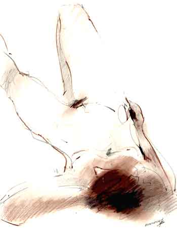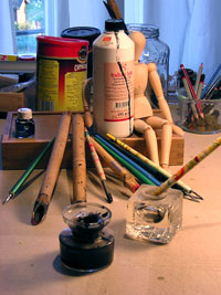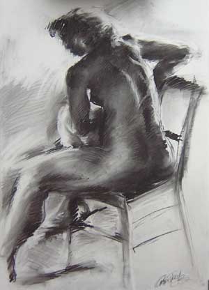 Bâton de charbon de bois de fusain, servant à dessiner. C'est aussi le nom donné au dessin exécuté avec un fusain. Le fusain est un arbrisseau de l'hémisphère nord tempéré, qui fournit un bois dense qui est très utilisé en marqueterie et en tournerie. Je l'utilise surtout sur du papier légèrement structuré et pour esquisser sur toile mes futures peintures à l'huile ou acrylique. Pour l'effacer ou retrouver les blancs du papier, j' emploie une gomme à fusain constituée de mie de pain ou de pâte à modeler. Le fusain se suffit à lui-même ou il peut se combiner à d'autres techniques (craie blanche, pierre noire, sanguine, pastel,etc...). Personnellement j'ai expérimenté la technique qui consiste à revenir dans le dessin à l'aide d'un pinceau trempé dans la thérébentine on obtient un effet de lavis à l'encre de chine très intéressant. Afin d' obtenir de grandes surfaces grisées j'étale le fusain à l'aide d'une aile de pigeon (qui sert aussi d'estompe), au doigt ou au chiffon. Pour fixer le fusain définitivement rien de tel que la recette de la gomme laque diluée dans de l'alcool à brûler que je pulvérise à l'aide d'un pulvérisateur à bouche.