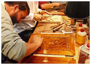 la MARQUETERIE n.f. Assemblage décoratif de lamelles de bois d'essences et de couleurs variées ou de feuilles de métaux, de nacre, d'écaille, etc ... Employé en revêtement, notamment sur un ouvrage d'ébénisterie.