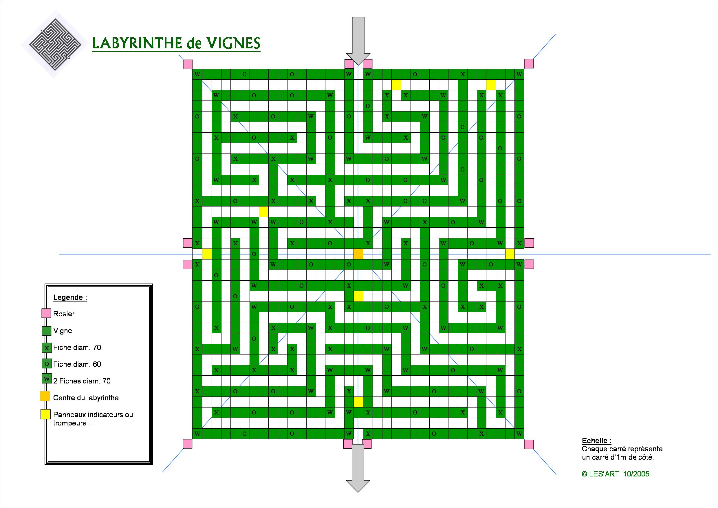 Les lignes noires symbolisent les plantations de vigne Les lignes blanches sont les chemins (ou route) serpentant entre les vignes. L’ensemble s’inscrit dans un carré de 40 m de côté. La vigne ne trace plus ici des routes parfaitement rectilignes, mais elle s’amuse à perdre le visiteur …Une complément ludique au sentier du vigneron.