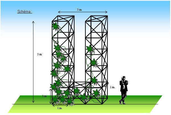 Matière Treillis en cuivre autoportés fabriqués en profilés de cuivre de 5 mm d’épaisseur. Un grillage en acier galvanisé à large trou (5 x 5 cm) est placé sur chaque face visible afin de faciliter l’accrochage naturel des plantes. Au pied un lit de fougère complétera la composition. Végétaux grimpants du type : clématite, vigne vierge , chèvrefeuille. Le cuivre sera oxydé afin de présenter une teinte « vert de gris », cela a le double avantage d’être très esthétique et de protéger le métal contre les assauts du temps.