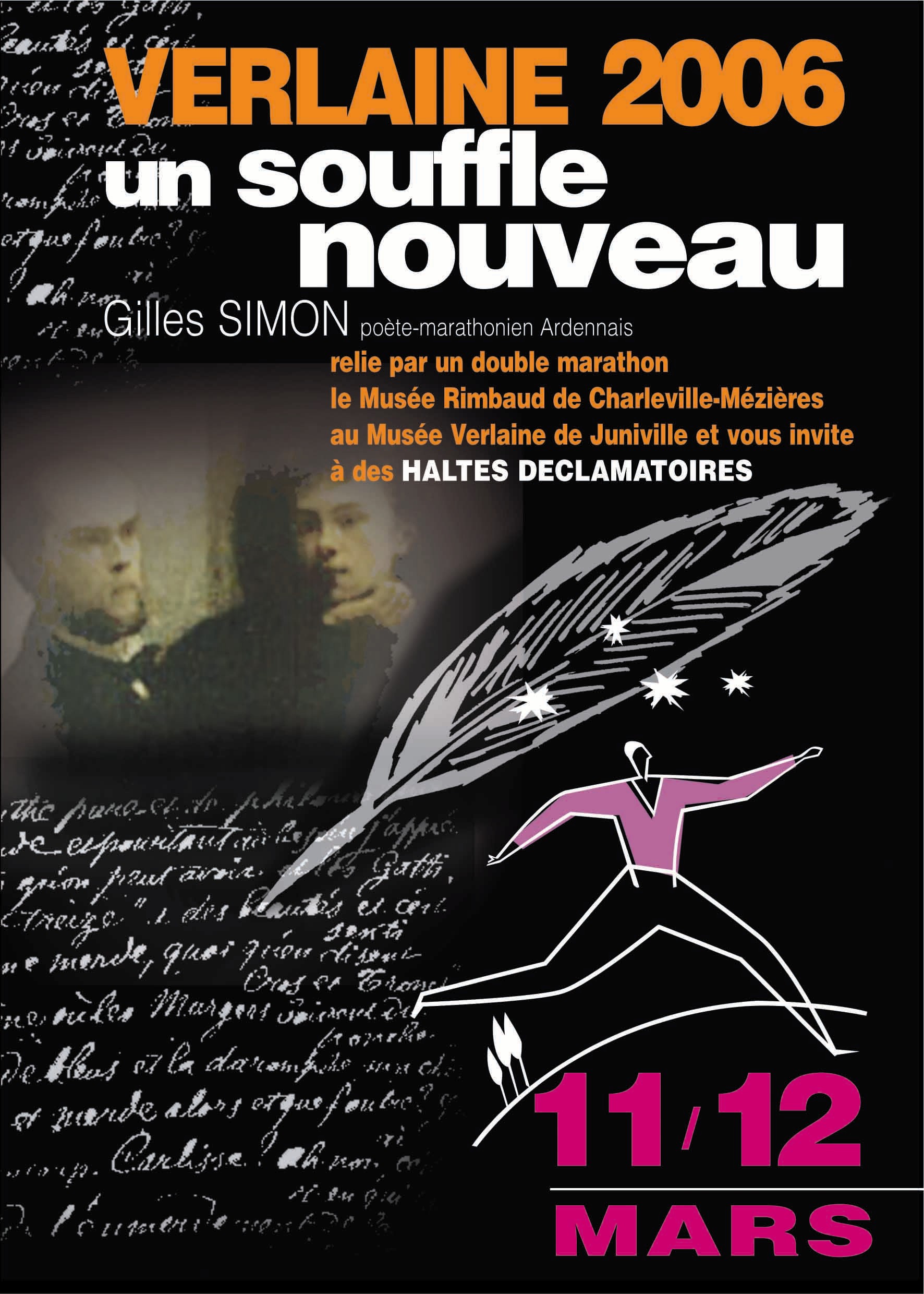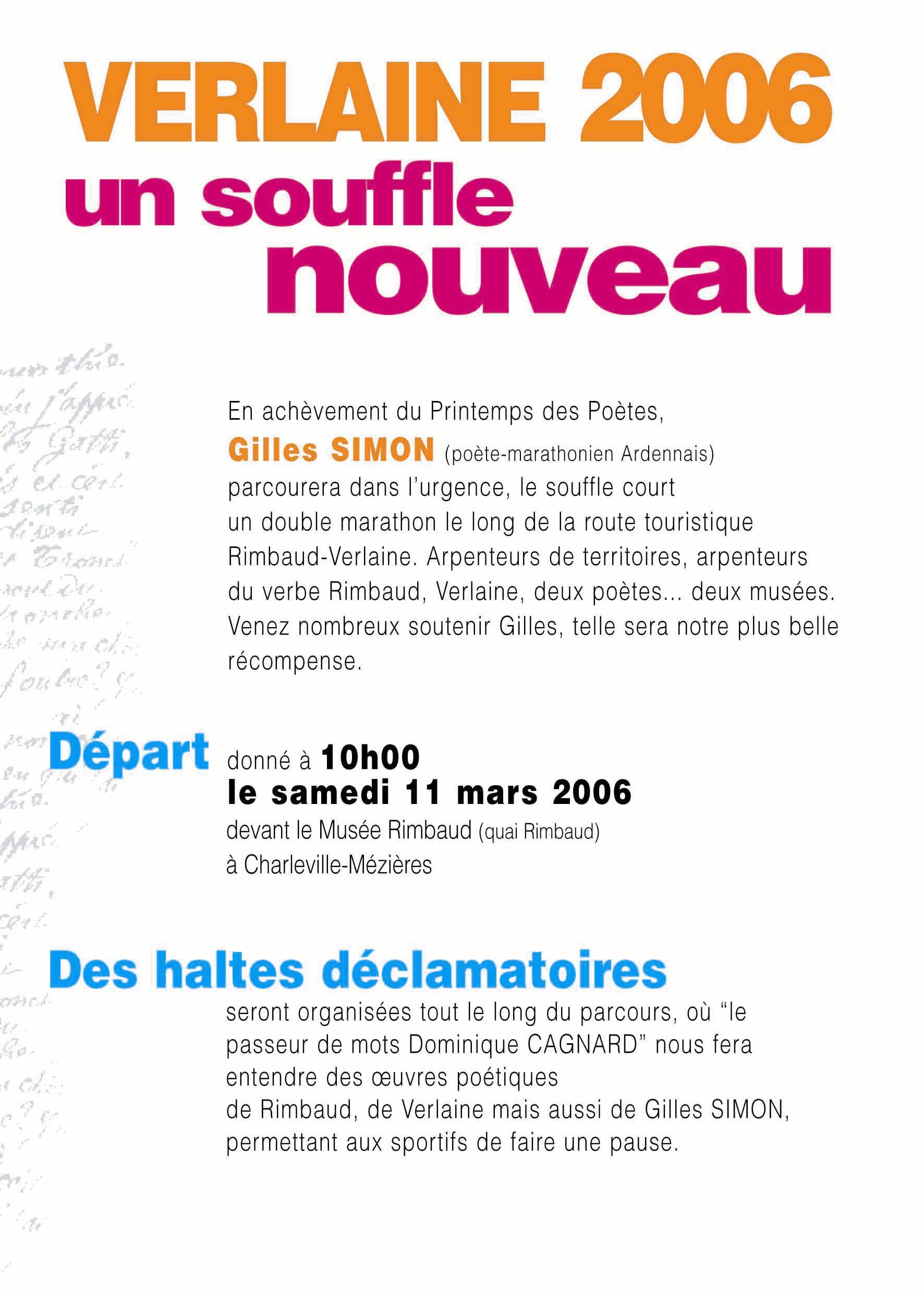 A l'occasion du Printemps des poètes (11 et 12 Mars 2006), Gilles Simon, poète-marathonien installé à Charleville, va parcourir la route Rimbaud-Verlaine (entre le Vieux Moulin à Charleville-Mézières et l'Auberge du Lion d'Or à Juniville) pour sensibiliser l'opinion sur le maintien du musée Verlaine. En 2004, le projet Rimbaud, à l'occasion de la commémoration du 150e anniversaire d'Arthur Rimbaud, consistait en un relais pédestre et poétique sur les traces de Rimbaud entre Addis-Abeba et Harar en Ethiopie. Le projet a vu le jour, hélas sans grand retentissement médiatique.
