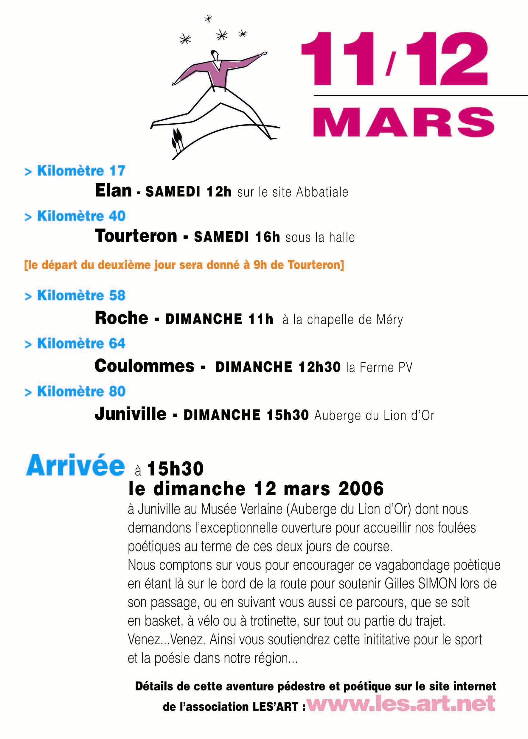 Aujourd'hui, Gilles Simon utilise un support analogue pour célébrer les grands arpenteurs du verbe et de l'espace que sont Rimbaud et Verlaine : relier les 80 Km, soit un double marathon, séparant le Vieux Moulin (Musée Rimbaud) et l'Auberge du Lion d'Or (Musée Verlaine). Cette démarche sera le symbole d'un Rimbaud (enfin) reconnu volant au secours d'un Verlaine (encore caché, voir honni). Il est précédé d'un véhicule ayant à son bord un reporter photographe et un récitant professionnel. Le récitant déclame devant un public à cinq reprises (Elan office de tourisme, Tourteron halle fruitière, Méry chapelle, Coulommes ferme de Verlaine, et Juniville Auberge du Lion d'Or). Tous les amis de Rimbaud et de Verlaine, coureurs et marcheurs, sont conviés à accompagner Gilles sur certains tronçons et/ou assister aux déclamations poétiques. Il faut que l'Ardenne du mouvement de la nature et de la poésie se lève et se bouge.